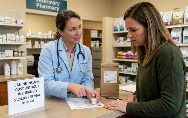 Before filling a new insulin prescription or refilling an existing one, call at least two or three pharmacies and ask for their cash price on the specific insulin, strength, and quantity your vet prescribed. A five-minute comparison call can save $30 to $60 per fill.